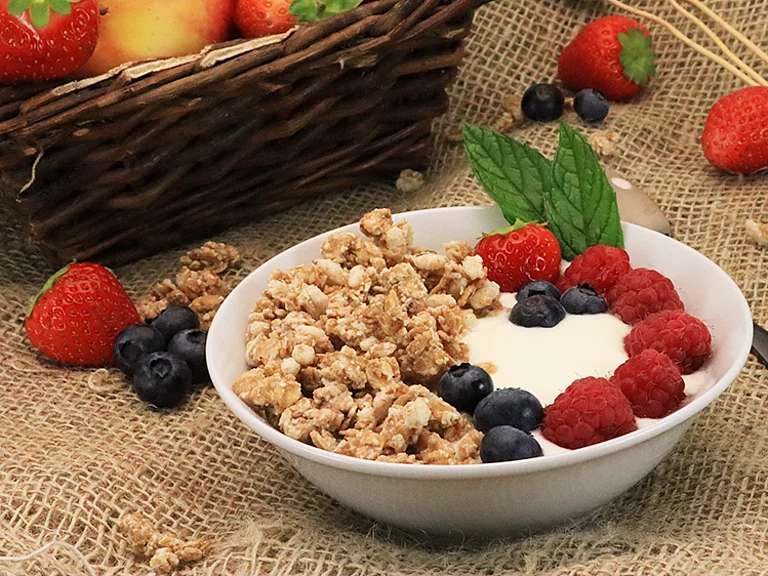 Especially children love this crunchy, baked muesli-experience. Because of this, it is particularly important to maintain the healthy, natural qualities of our ingredients. During the production procedure we make sure to always process our products with due care, keep sugar levels low, and avoid artificial preservatives, colouring and flavouring.