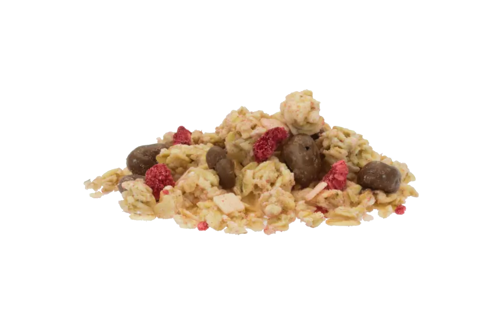 Every spoonful is pure joy! This is one of our favourite combinations: Oat Crunchy with berries and chocolate. The faintly sour notes of freeze-dried raspberries combine with sweet milk chocolate and crispy Oat Crunchy to create a delicious muesli harmony.